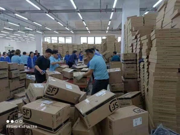 此外更需要發貨人員和場地上的合理規劃,人員的完美配置,包裹的分類擺放,會大大縮短工作時間,提高工作效率。為此我們騰空了待檢庫房為發貨場地,重新安裝傳送帶,保潔人員利用休息時間將整個發貨區疊滿了紙箱,信息部重新布置電腦、掃描槍等電子設備,全員通力合作,場地和貨品、包裝盒等等一應俱全。